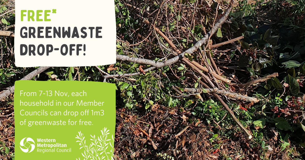 From November 7-13, Member Council* residents can drop off up to 1m3 of greenwaste at the West Metro Recycling Centre for FREE – this is approximately a small ute tray or trailer load.